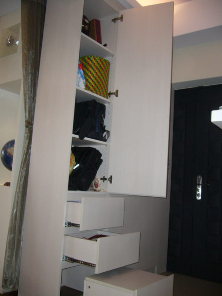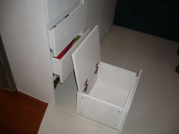 在櫃子最左邊是可以放包包的層櫃,抽屜可以放出門塑膠購物袋,最底下的是模仿雜誌的設計,一個活動的抽屜,有蓋子,裡面可以放東西,人也可以坐在上面穿鞋子,但是.....