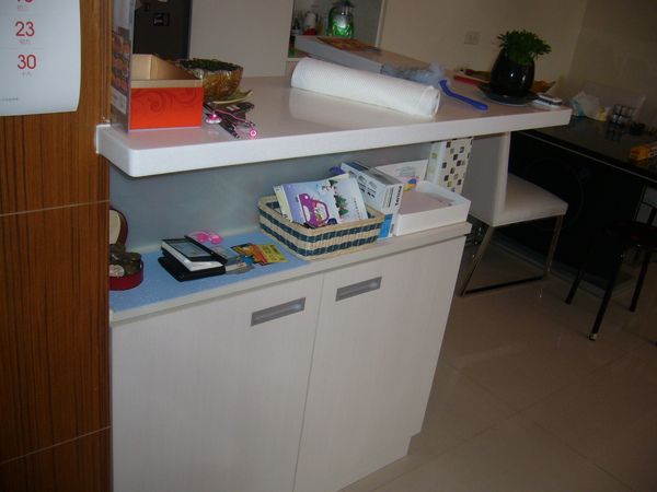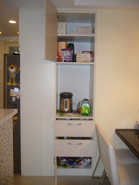 這是餐桌旁的小餐台加零食櫃,後來我們把它拿來放熱水瓶與冷水與杯子,很恰當~