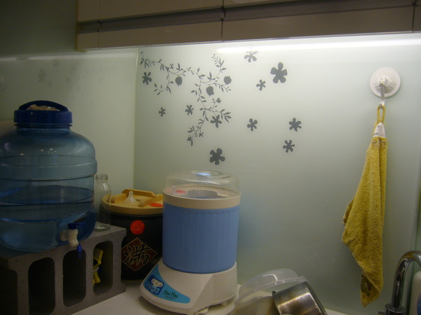 廚房,強化玻璃與杜邦人造石檯面是我堅持的,其他的就任由設計師安排,很高興設計師幫我們弄了一個畫龍點睛的花朵圖案在牆面角落,讓整體看起來不會太素、太單調!