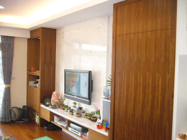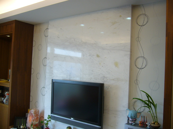 電視牆用的是雲石裝飾,兩旁貼壁紙點綴,再往兩邊看是一邊是簡約式佛堂,一邊是對襯的木牆,疑??是牆嗎?