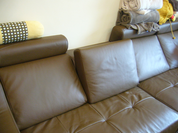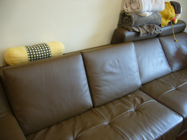 我們選的這款是直接殺到人家工廠去買的,形式、長寬、皮色、硬度、五金配件均可任意改變,所以我們改了一些重點,長度必須能讓「少女夢幻搖籃椅」擺得下,高度要讓小孩子爬得上去,貴妃椅的部分要能切開來(這樣可以坐得下更多人),但是這款顏色曾經讓蝴蝶媽透過電話大罵蝴蝶爸一頓:「你知道你買了一條大便回來嗎?」,拜託!有那麼誇張嗎?後來等桌子與木地板都弄好後,這陀大便就顯得非常調和了!(嚇死蝴蝶爸了,要是真的不合,他大概要咬舌自盡囉!)