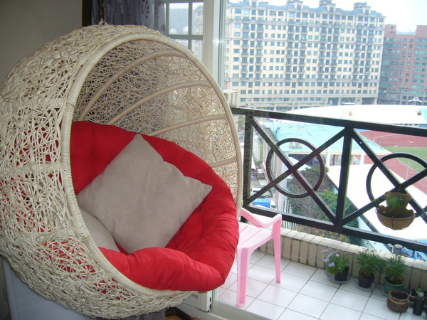 蝴蝶爸堅持要買給蝴蝶媽的「少女夢幻搖籃椅」,坐在上面發呆、風景、看書都很棒哦!不過有個小問題,它無法固定方向,所以有時會轉成面壁思過,哈哈!