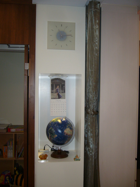 另外我們還打掉一段牆,改以木工訂出一個多功能櫃子當隔間牆使用,正面只在上方挖出一點點的凹槽,剛好放進蝴蝶爸的表妹--涵涵所做的十二生肖軟陶作品,真是將將好!!