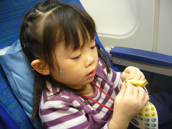 這次的過程小蝴蝶真的很乖,第一段台北飛香港,起飛時蝴蝶媽就一直告誡她,待會兒飛機會「咻~~」的起飛,引擎也會轟轟隆隆地響,搞得她很緊張的一直問,要起飛了嗎?要飛了嗎?手還一直抓緊座椅扶手!直到穩定後才放鬆心情開始吃東西、玩樂!而下降前我們也是先告知她等一下會「碰碰」,要扣緊安全帶等等注意事項,一開始她還搞不懂為啥要再扣安全帶,但膽小怕死的她一聽到阿爸說,你如果不綁好安全帶,等一下飛機降落時會「碰碰碰」東倒西歪,妹妹可能會飛出去或撞傷、痛痛~~,她馬上坐好,扣緊安全帶,雙手抓緊扶手,然後又是一連串發問「要降落了沒?要降落了嗎?.....」,降落實果然也不辜負她的期望,果真碰碰了好幾下,小蝴蝶很滿意的說,真的會碰碰哦!