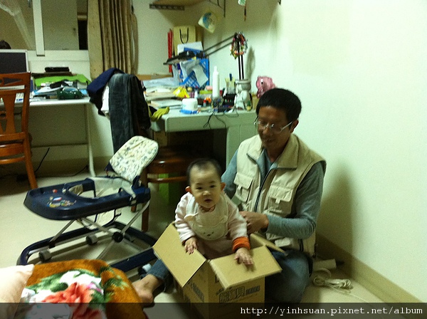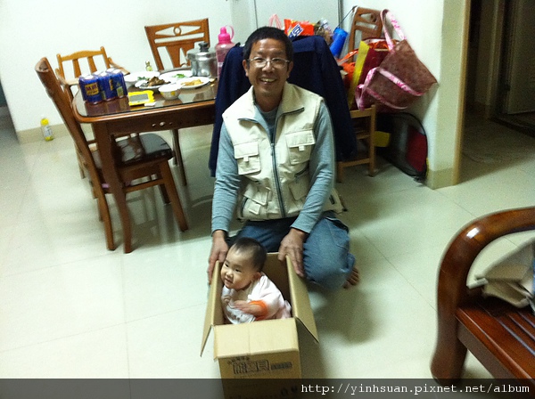 讓小狐狸坐在箱子裡面 推他在屋子裡到處走