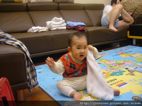這天我在客廳折他阿爸的衣服