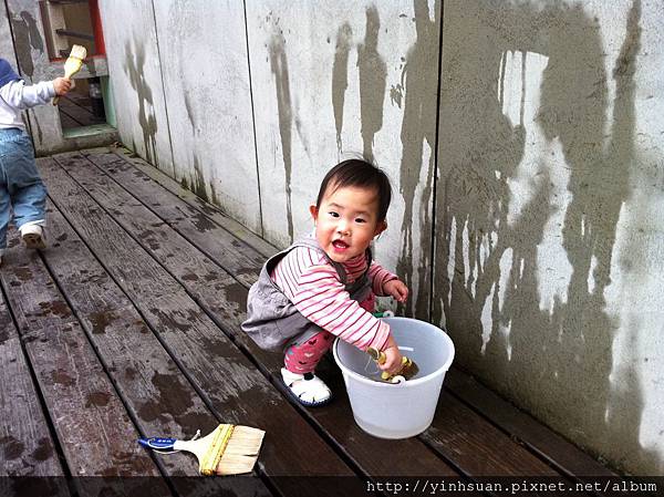 小狐狸不想畫牆壁 但是一直在玩水桶裡的水 還來回回去換牆上的刷子