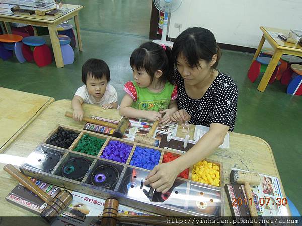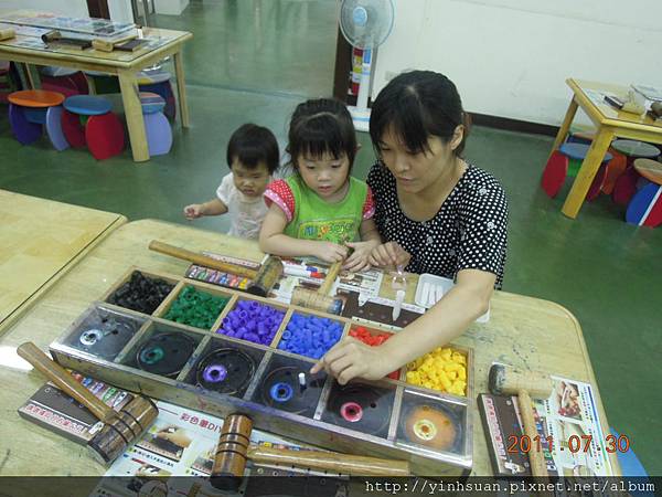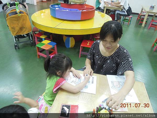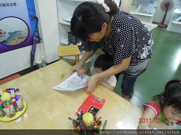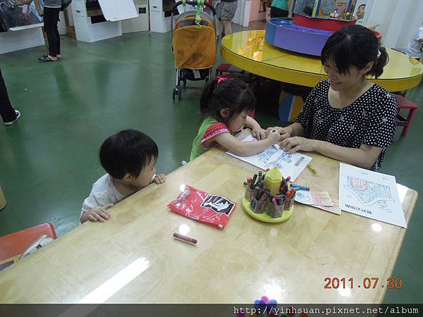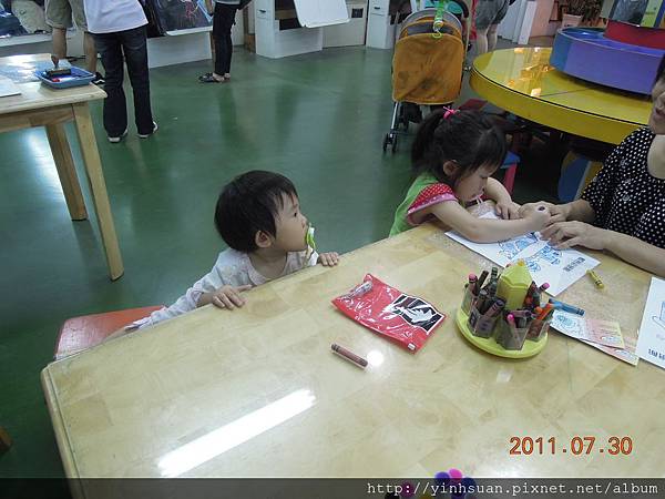 第一站 畫畫 用一個有刻痕的版子墊在底下 在用蠟筆畫 可以有不同的紋路喔