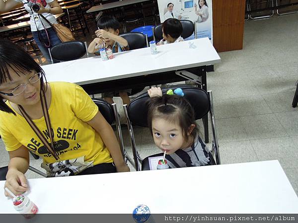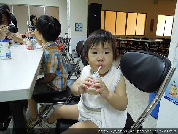 參觀完工廠 有個媽媽說他們養樂多喝不完 小蝴蝶再喝一罐