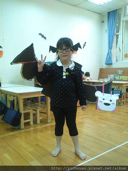 懶得拿糖果袋 就把她掛在翅膀上 (ㄟˊ鞋盒糖果籃怎麼不見了~~因為沒找到適當材料做把手 加上 翅膀道具太龐大 又被阿姆勸說不要帶了)